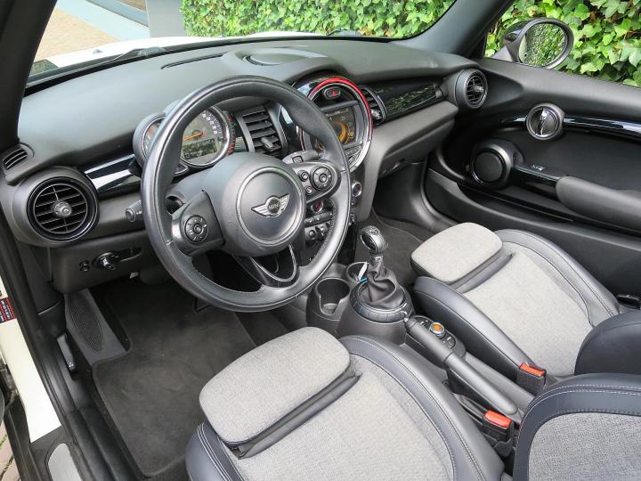 Zeer nette, goed onderhouden Mini Cabrio Cooper F57 in de kleur Pepper White met een zwarte stoffen kap, zwarte 17" Cosmos Spoke lichtmetalen velgen en een half leder Carbon Black sportinterieur met een Carbon Black colourline en Piano Black interieurdelen! Deze Cooper Cabrio heeft slechts 1 eigenaar gehad die er slechts 59.399km mee heeft gereden. De Cabrio is o.a. uitgerust met een origineel windscherm, Park Distance Control (PDC) achter, LED kop- en mistlampen, climate control, lederen multifunctioneel sportstuur met cruise control, stoelverwarming, lichtpakket en opbergpakket.