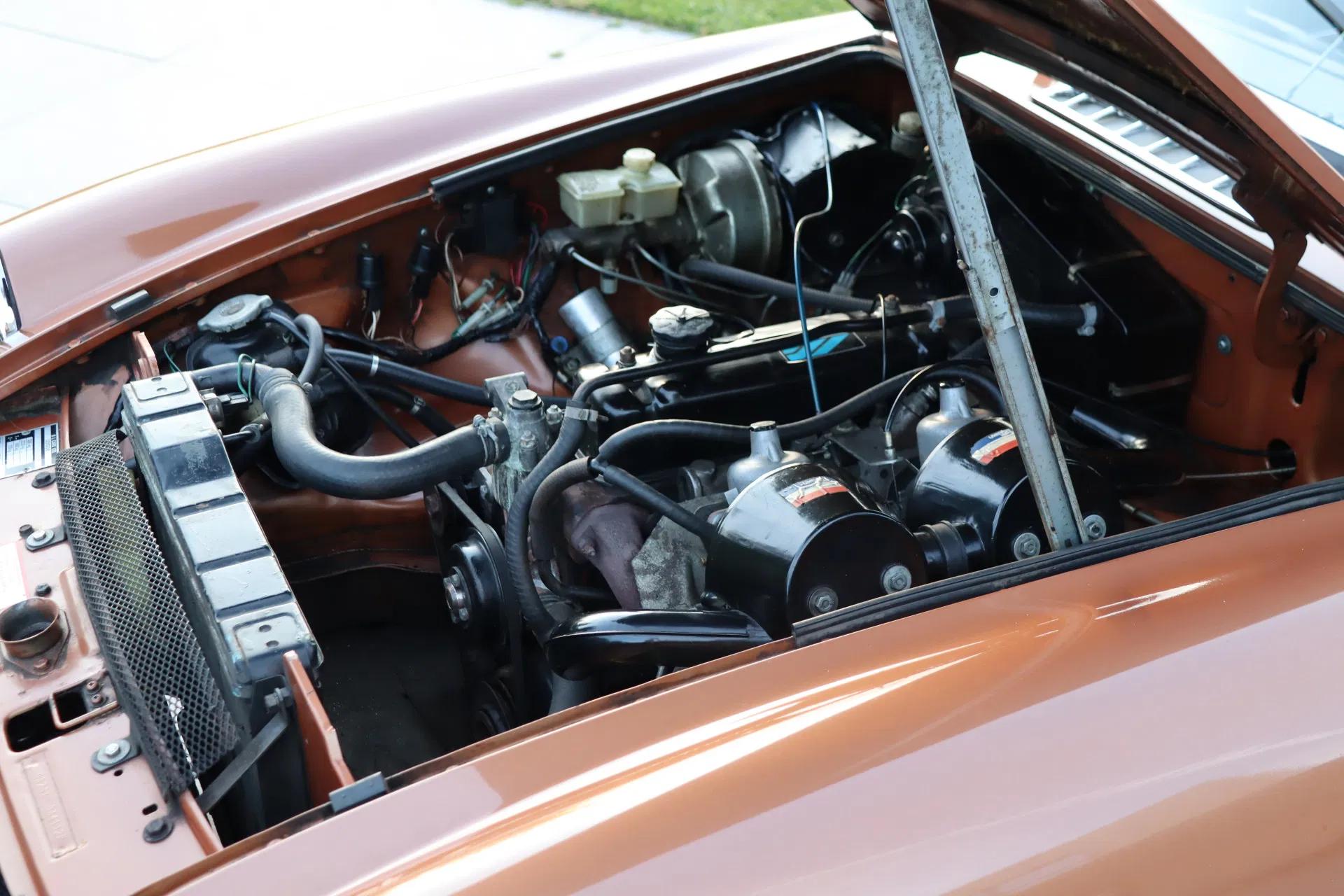 All 420 roadsters built were originally finished in bronze metallic paint with gold striping on the side and orange seat upholstery. A beautiful and retro colour combination. This example is free of damage and rust and is still in its original paint. The rubbers, lighting and chrome work are in good condition. The overall visual condition is good with only minimal signs of wear. Characteristic of the later B models are the front spoiler and the popular 4-spoke alloy wheels, which are also in good condition. The soft top is also in good condition with no tears or damage, and the fastenings work well.